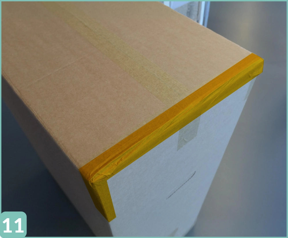 Close the top of the box by folding the short sides first, then the long sides. Then secure the top with the longest piece of tape (F).