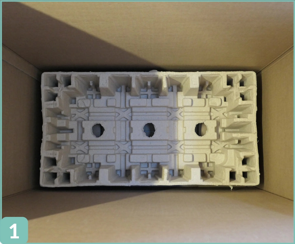 Place the return carton (A) upright and insert the lower pulp insert (H) with the recess facing upwards and the number 6.571-071.0 into the carton.