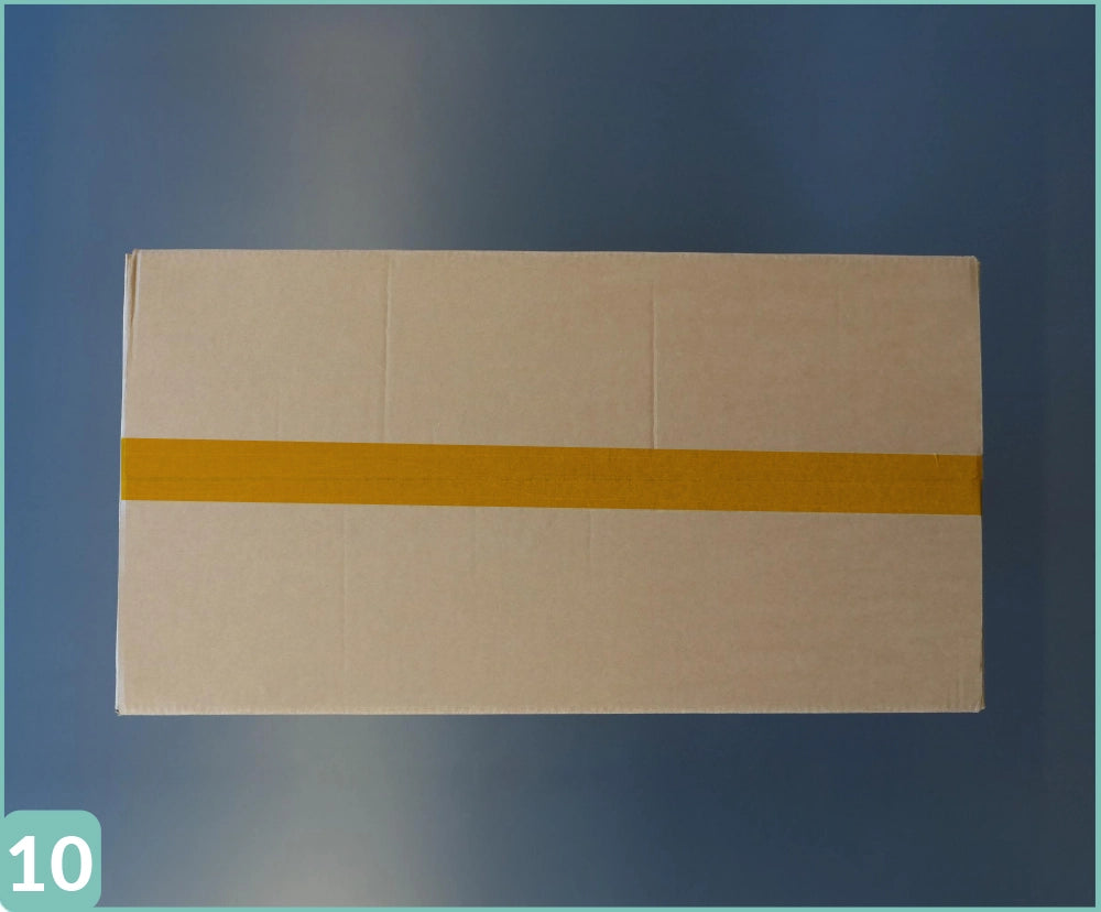Close the top of the box by folding the short sides first, then the long sides. Then secure the top with the longest piece of tape (F).
